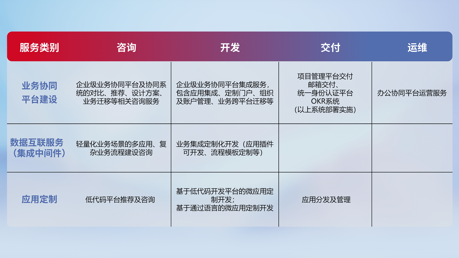针对钉钉、、、、企微、、、IDaas等平台级产品提供产品的规划、、、、方案、、、、交付、、、定制化开发等服务,,,,实现如统一协同办公、、智能客户服务、、、混合会议管理、、智能数据查询、、、等业务场景,,,实现数字化转型。。。。