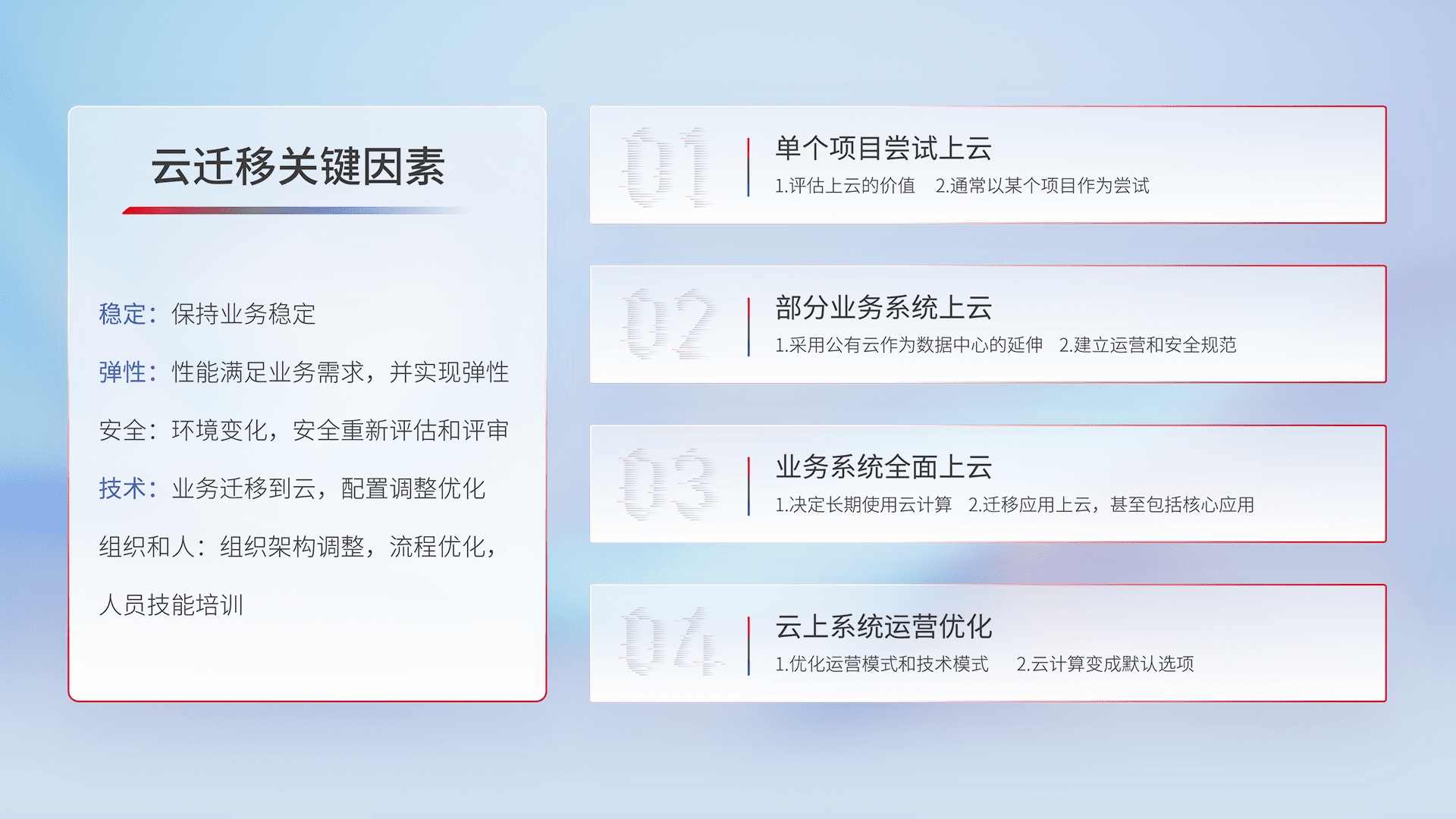 结合实际业务,,,从规划设计、、、云平台选型、、云原生改造、、数据迁移、、集成交付,,,迁移全过程为客户识别最佳上云路径,,,,做好风险识别管理,,,,设计网络架构、、身份权限、、、、安全审计合规、、、、操作审计、、、、日志审计、、、、监控告警策略、、多站点容灾设计等,,,对云上基础设施进行整体规划,,,提升IT治理水平,,,,以满足弹性、、、高可用、、、、高性能的需求。。
