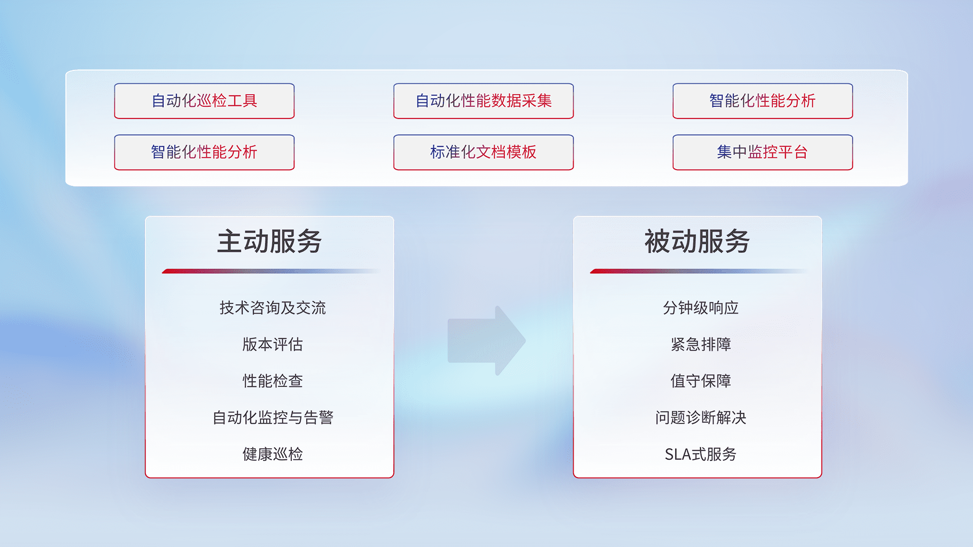 智能化工具和标准化文档,,,,保障服务质量,,,,提供主动服务(包含技术咨询、、版本评估、、、、性能检查、、、、自动化监控与告警、、健康巡检)和被动服务包含(分钟级响应、、紧急排障、、、值守保障、、、问题诊断解决、、SLA服务)。。。