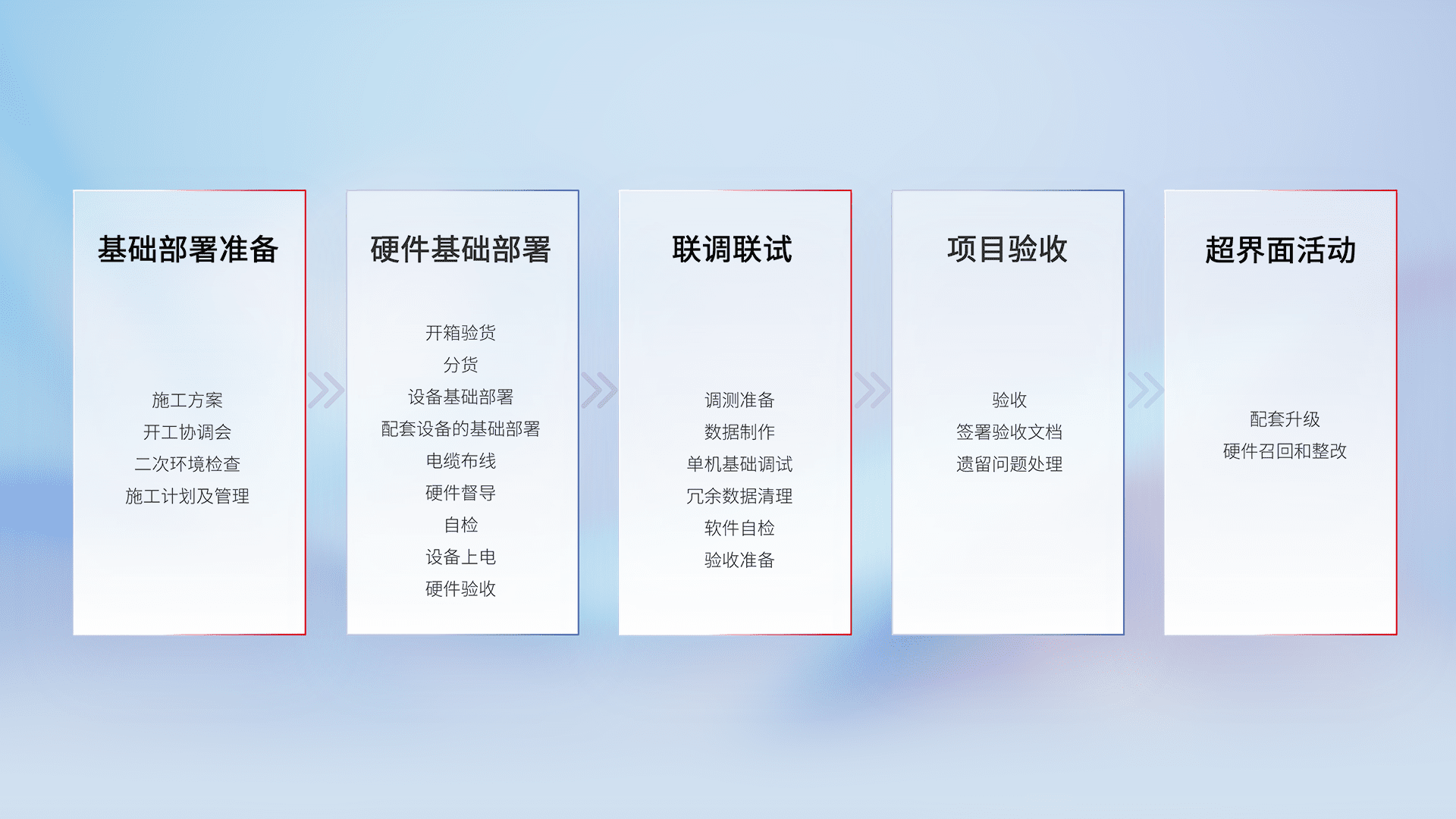 从基础部署准备、、、、硬件基础部署、、、、联调联试、、、项目验收、、、越界面活动的全过程可追溯,,保证施工质量和进度。。。